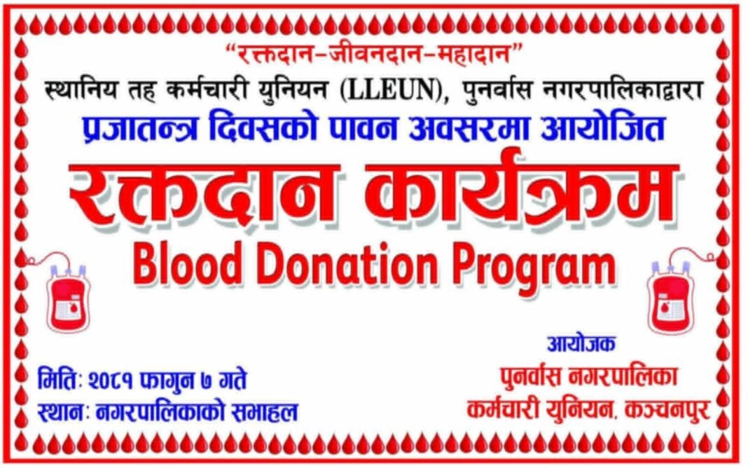 किशोर तामाङ पुनर्वास महेन्द्रनगर । कञ्चनपुरको दक्षिणी भेग स्थित पुनर्वास नगरपालिकामा कर्मचारी युनियनले रक्तदान कार्यक्रमको आयोजना गर्ने भएको छ ।