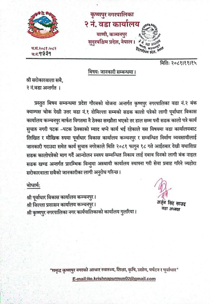 कृष्णपुर नगरपालिका वडा नम्बर २ का वडाध्यक्ष अर्जुन साउँदले अलपत्र सडकमै अस्थायी वडा कार्यालय स्थापना गरेर नागरिकहरुलाई सेवा दिइरहेका छन् ।