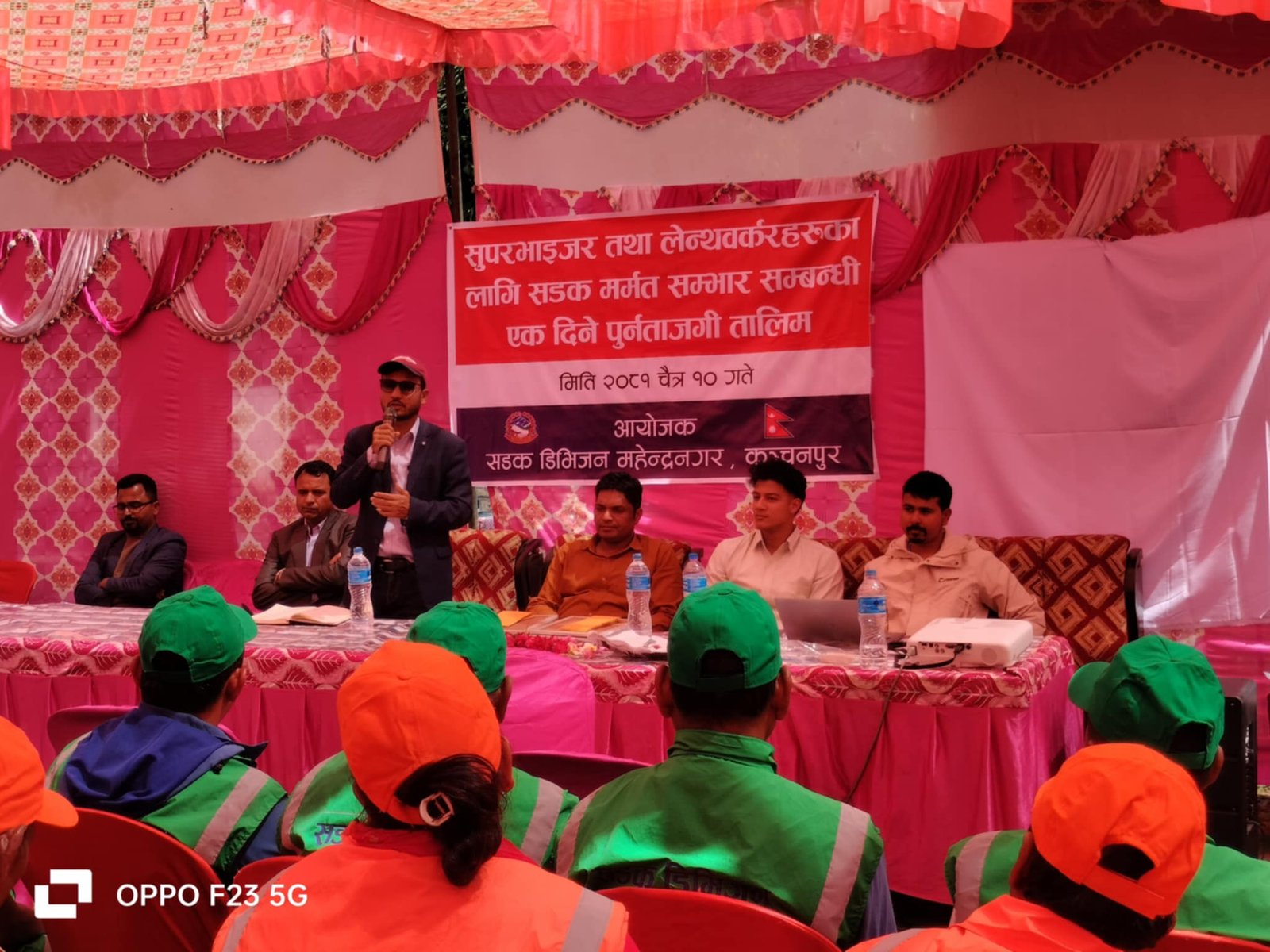 कार्यालयले सुपरभाइजर तथा लेन्थवर्करहरुलाइ सडक मर्मत सम्भार सम्बन्धी एक दिने पुन–ताजगी तालिम दिएको हो।कैलाली र कञ्चनपुरमा रहेका ५५ जना लेन्थवर्करहरु र ८ जना सुपरभाइजर हरुलाई एक दिने पुन–ताजगी तालिम दिएको सडक डिभिजन कार्यालय कञ्चनपुरका प्रमुख राजेश कुमार यादवले बताउनु भयो ।