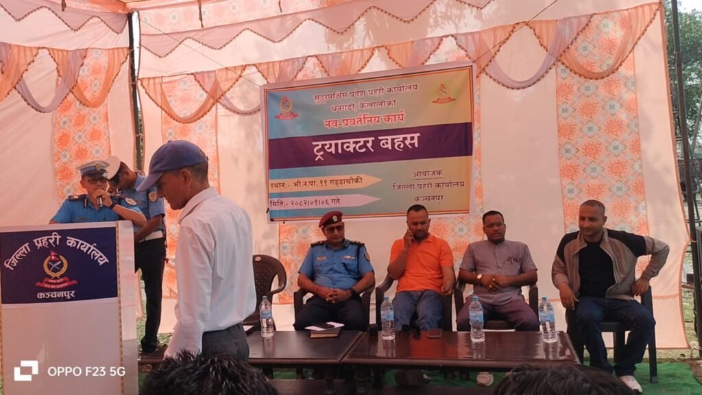 सुदुरपश्चिम प्रदेश प्रहरी कार्यालय धनगढी कैलाली द्धारा नव–प्रवर्तनिय कार्य अन्र्तरगत शनिबार जिल्लाको पश्चिमी सिमा गडचौकीमा एक दिने ट्रयाक्टर बहस कार्यक्रम सम्पन्न गरेको हो ।
