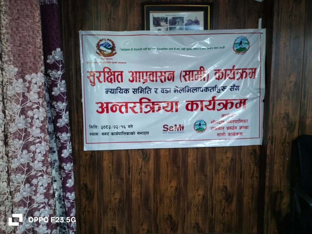 महेन्द्रनगर । भीमदत्त नगरपालिकामा सुरक्षित आप्रवासन ९सामी० कार्यक्रमको आयोजना गरिएको छ । शुक्रबार पालिकाको रोजगार सेवा केन्द्रले न्यायिक समिति र वडाका मेलमिलापकर्तासँग अन्र्तक्रिया कार्यक्रम गरिएको छ ।