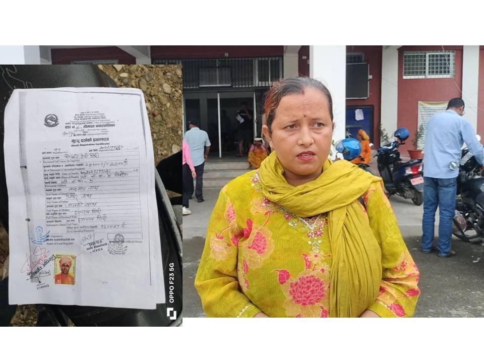 महेन्द्रनगर । कञ्चनपुरमा श्रीमानले जिउँदै भएकी श्रीमतीको मृत्युदर्ता गरेका छन् । जिल्लाको भीमदत्त नगरपालिका ४ गोबरैया महेन्द्रनगरमा दयाराम गिरीले श्रीमती गोमतीदेवी गिरी नाथ को मृत्युदर्ता गरेका हुन् । दयारामले जेठी श्रीमती गोमती कालगतिले मरेको भन्दै भीमदत्त नगरपालिका– ४ वडा कार्यालयमा मृत्युदर्ता गरेको रहस्य खुलेको छ