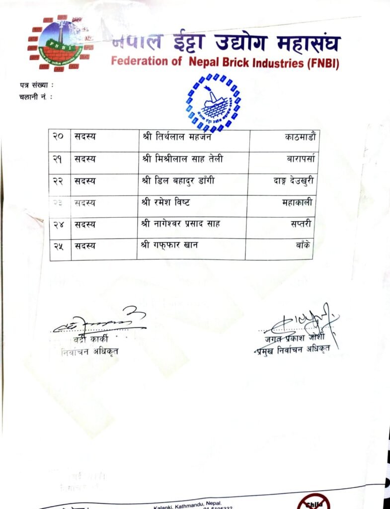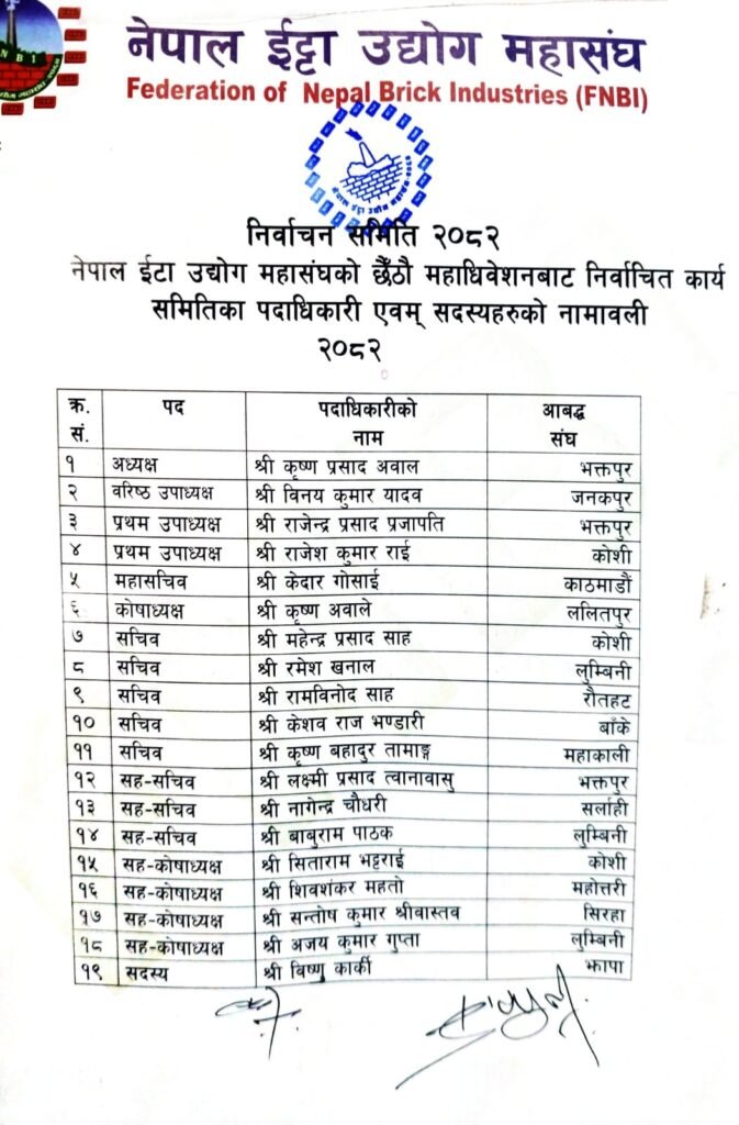 काठमाडौं। नेपाल ईँट्टा उद्योग महासंघको छैठौँ महाधिवेशनबाट नयाँ कार्यसमिति सर्वसम्मत चयन भएको छ। निर्वाचन समितिद्वारा सार्वजनिक नामावली अनुसार अध्यक्षमा भक्तपुरका कृष्णप्रसाद अवाल चयन भएका छन्।