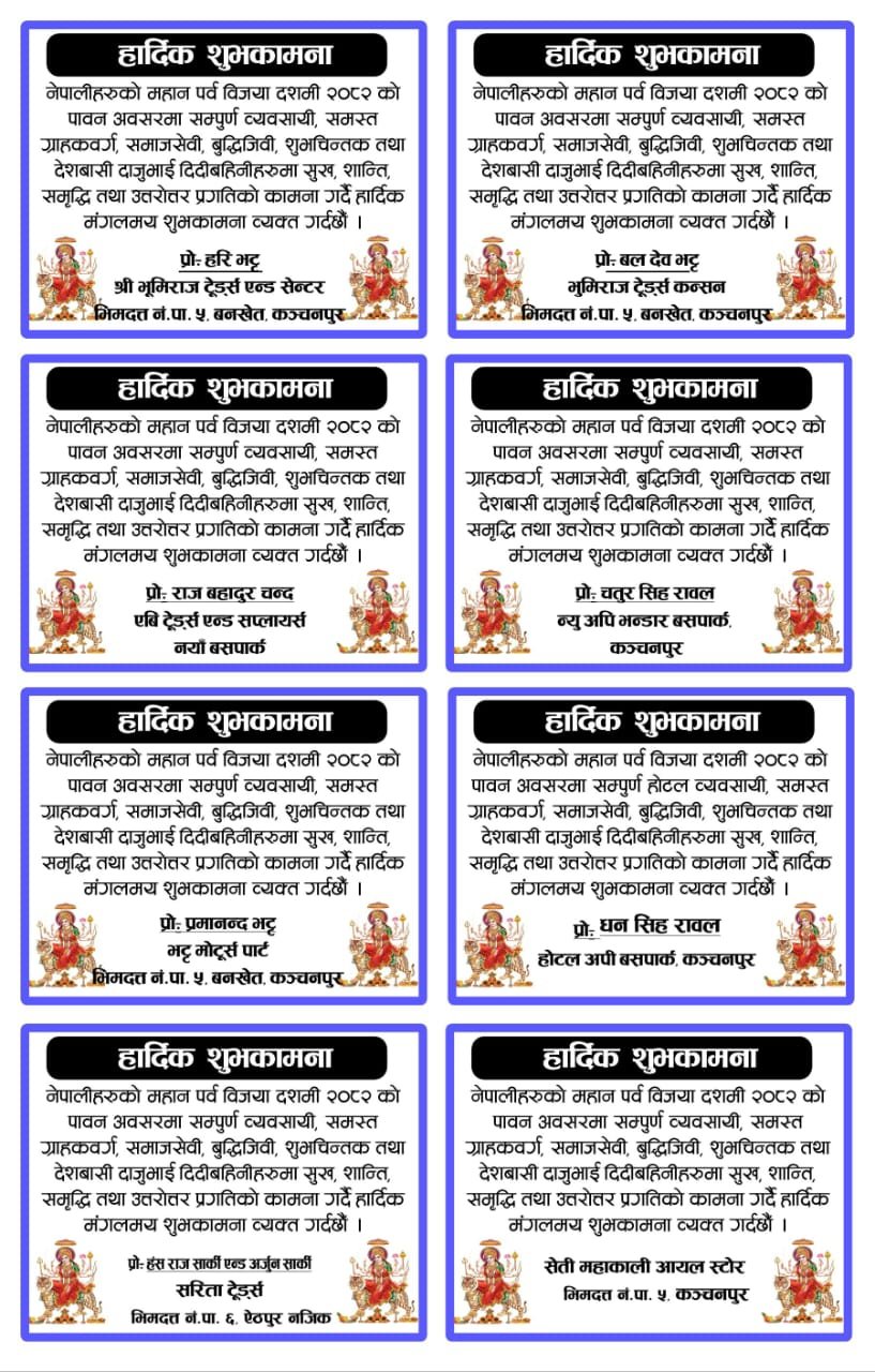 Published by: Abhaash Published on: September 24, 2025 16 FacebookTwitterPinterestWhatsAppCopy URL ताजा समाचार नेताहरुको झुटो प्रचार र सञ्चार माध्यमको भूमिकाले जनताको मत जोखिममा Abhaash - January 28, 2026 कञ्चनपुर बुधबार सुदुरपचिम लगाएत यी स्थानमा हुने छ वर्षा January 27, 2026 राजनीति जनतामा परीक्षण नभएका काँग्रेस कञ्चनपुरका पुर्व सभापति बोहरा ३बाट चुनावी यात्रामा January 27, 2026 अन्य कञ्चनपुरमा यसरी मनाइयो ७४ औ अन्तराष्ट्रिय भन्सार दिवस January 27, 2026 Load more सम्बन्धित समाचार कञ्चनपुरमा यसरी मनाइयो ७४ औ अन्तराष्ट्रिय भन्सार दिवस Abhaash - January 27, 2026 कपाबाट कञ्चनपुर १ र ३ मा बीना मगर र मान सुनार चुनावी मैदानमा Abhaash - January 19, 2026 समावेशी राजनितिमा कांग्रेसको कदमःबन्द सूचीमा हरिना कामी Abhaash - January 1, 2026