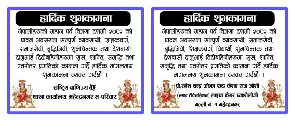 Published by: Abhaash Published on: September 26, 2025 5 FacebookTwitterPinterestWhatsAppCopy URL ताजा समाचार नेताहरुको झुटो प्रचार र सञ्चार माध्यमको भूमिकाले जनताको मत जोखिममा Abhaash - January 28, 2026 कञ्चनपुर बुधबार सुदुरपचिम लगाएत यी स्थानमा हुने छ वर्षा January 27, 2026 राजनीति जनतामा परीक्षण नभएका काँग्रेस कञ्चनपुरका पुर्व सभापति बोहरा ३बाट चुनावी यात्रामा January 27, 2026 अन्य कञ्चनपुरमा यसरी मनाइयो ७४ औ अन्तराष्ट्रिय भन्सार दिवस January 27, 2026 Load more सम्बन्धित समाचार कञ्चनपुरमा यसरी मनाइयो ७४ औ अन्तराष्ट्रिय भन्सार दिवस Abhaash - January 27, 2026 कपाबाट कञ्चनपुर १ र ३ मा बीना मगर र मान सुनार चुनावी मैदानमा Abhaash - January 19, 2026 समावेशी राजनितिमा कांग्रेसको कदमःबन्द सूचीमा हरिना कामी Abhaash - January 1, 2026