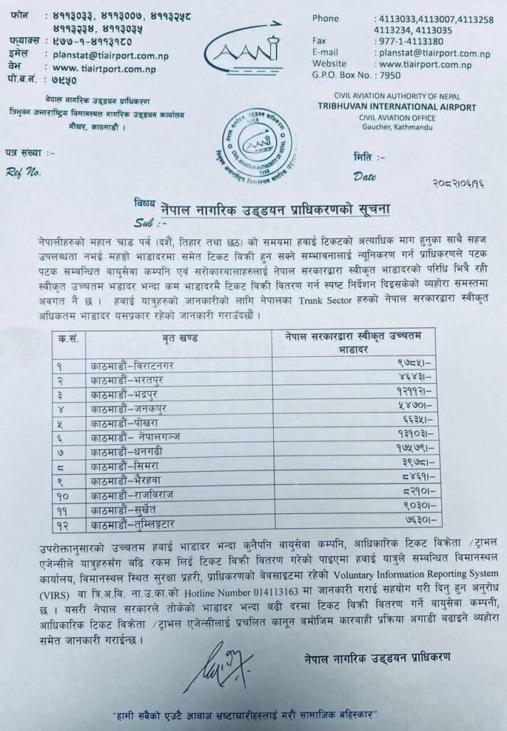 दसैँ, तिहार तथा छठको समयमा हवाई टिकटको अत्यधिक मागका कारण सहज उपलब्धता नहुने र महंगोमा बिक्री हुने सम्भावना न्यूनीकरण गर्न प्राधिकरणले देशभित्रका विभिन्न गन्तव्यका लागि अधिकतम भाडादर सार्वजनि गरेको जनाएको छ। सार्वजनिक गरेको भाडादर अनुसार सबैभन्दा धेरै भाडा काठमाडौं–धनगढीको १७ हजार ५७९ रुपैयाँ रहेको छ।