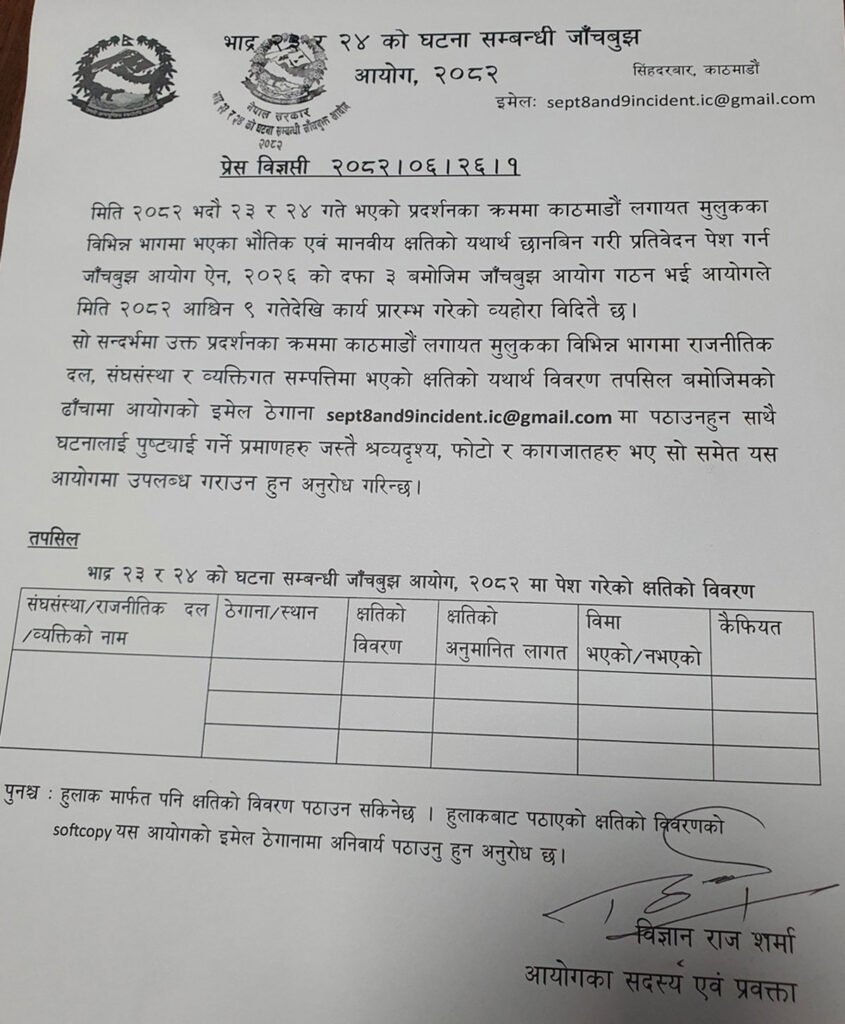आयोगले आज विज्ञप्ति जारी गर्दै प्रदर्शनमा काठमाडौँलगायत मुलुकका विभिन्न स्थानमा राजनीतिक दल, संघसंस्था र व्यक्तिगत सम्पत्तिमा भएको क्षतिको यथार्थ विवरण आयोगले तोकेको ढाँचामा पठाउन अनुरोध गरेको हो ।