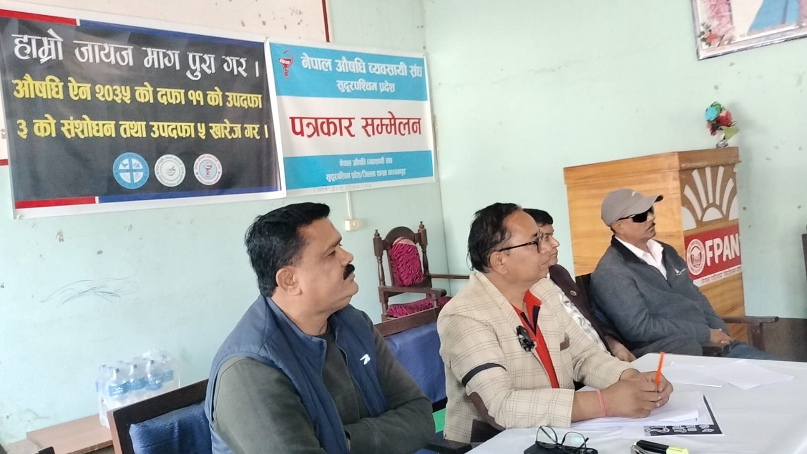 आन्दोलनकै विच सोमबार महेन्द्रनगरका नेपाल औषधी व्यवसायी संघ सुदूरपश्चिम प्रदेश समितिले पत्रकार सम्मेलन गर्दै औषधी ऐन ०३५को दफा ११को उपदफा ३को संशोधन तथा उपदफा ५ खारेजीको माग अघि सारेका छन । सरकारले औषधी व्यवसायीमाथि अन्याय गरेको भन्दै दैनिक १देखि २ घण्टा औषधी पसल बन्द गरेर आन्दोलनमा उत्रेका छन ।