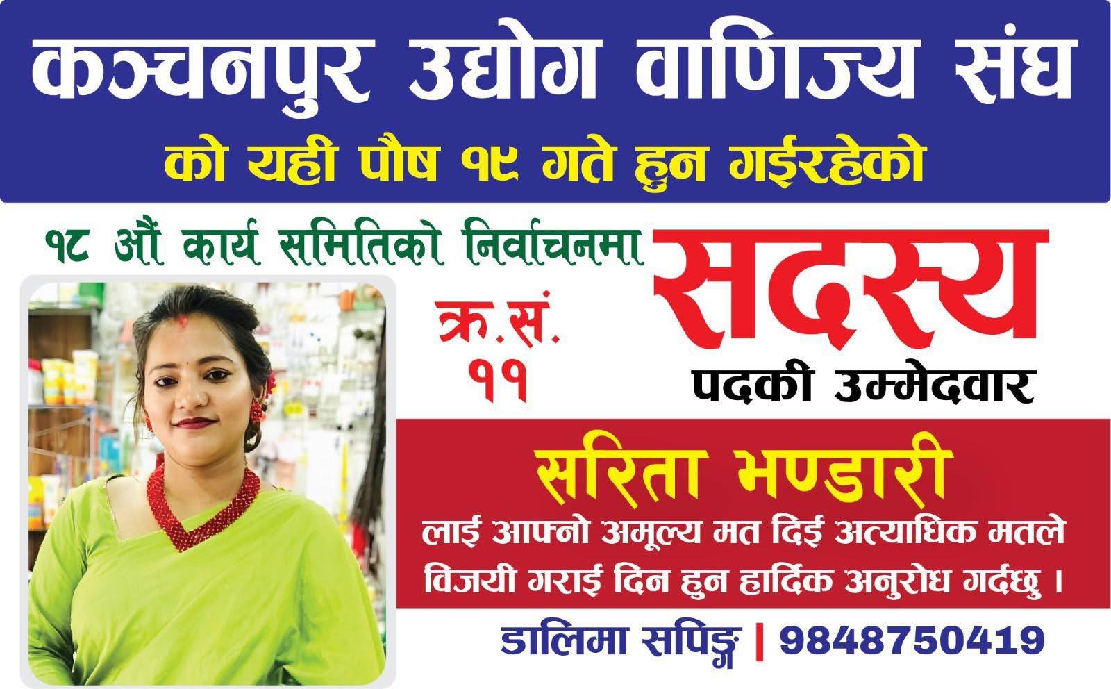 महेन्द्रनगर । १२ पुसमा कञ्चनपुर उद्योग बाणिज्य संघमा १८ कार्यकारिणी समिति निर्वाचनमा सदस्यको मनोनयन दर्तापछि सरिता भण्डारी र पार्वती कुमारी विष्ट संघको प्राङ्गणमा महिला मतदातासंगै बसेका थिए ।
