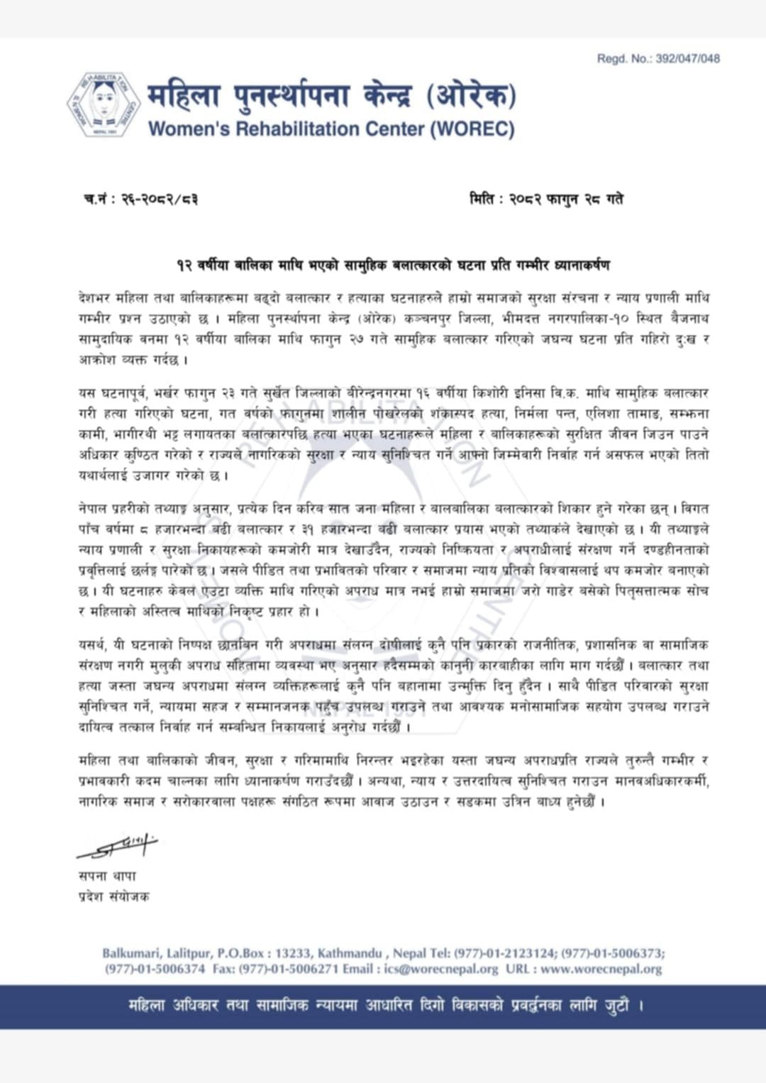 महिला तथा बालिकाको जीवन, सुरक्षा र गरिमामाथि निरन्तर भइरहेका यस्ता जघन्य अपराधप्रति राज्यले तुरुन्तै गम्भीर र