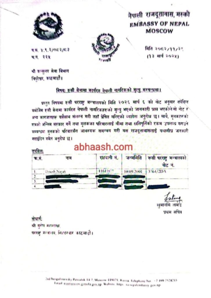रुसको राजधानी मस्कोमा रहेको नेपाली राजदुतावासले काठमाडौँमा स्थीत परराष्ट्र मन्त्रालय कन्सुलर सेवा विभागलाई रुसी सेनामा कार्यरत नेपाली दिनेश नायकको मुत्यु भएको पुष्टि गर्दै मिति २०८२÷११÷२९ गते पत्राचार गरेको छ । जसमा दिनेश नायक राहदानी नम्बर,जन्म मिति,रुसी परराष्ट्र मन्त्रालयको नोट नम्बर समेत उल्लेख गरिएको छ ।