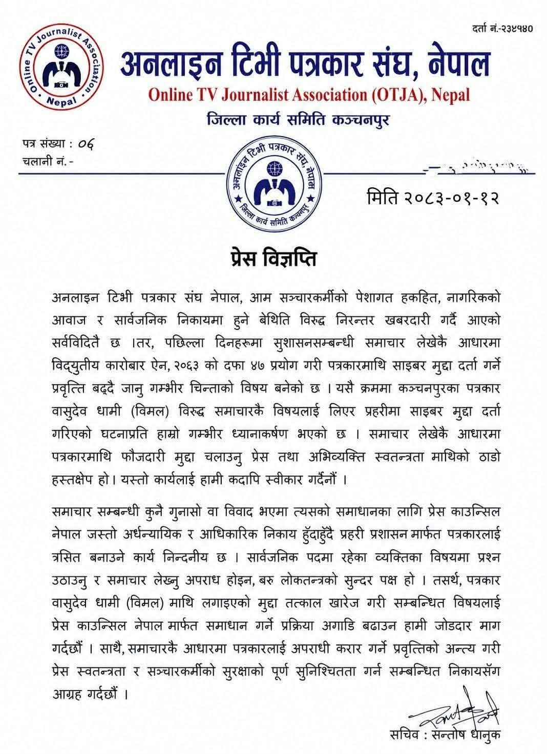अनलाईन भिटी पत्रकार संघ नेपाल कञ्चनपुरका सचिव सन्तोष धानुकले हस्ताक्षर गरेको विज्ञप्तीमा सार्वजनिक पदमा रहेका व्यक्तिका विषयमा प्रशन उठाउनु र समाचार लख्नु अपराधन नभई बरु लोकतन्त्रको सुधार पक्ष भएकाले पत्रकार धामीमाथि लगाएको मुद्दा खारेजी गर्न माग अघि सारेका छन ।